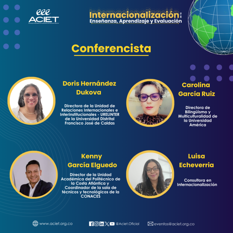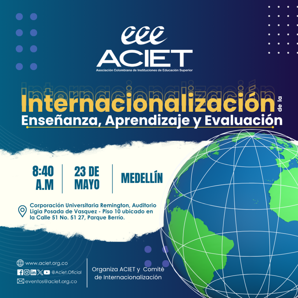 La Asociación Colombiana de Instituciones de Educación Superior – ACIET presenta a la comunidad académica el Encuentro Nacional de Directores de Internacionalización, denominado INTERNACIONALIZACIÓN DE LA ENSEÑANZA, APRENDIZAJE Y EVALUACIÓN, el cual tiene como objetivo fortalecer las habilidades y competencias de los directores de internacionalización y sus equipos de trabajo entorno a las estrategias programáticas para incluir en el currículo, los métodos, materiales y ambientes de aprendizaje, dimensiones internacionales, multiculturales y globales pertinentes, de acuerdo con los lineamientos establecidos por el Ministerio de Educación Nacional.