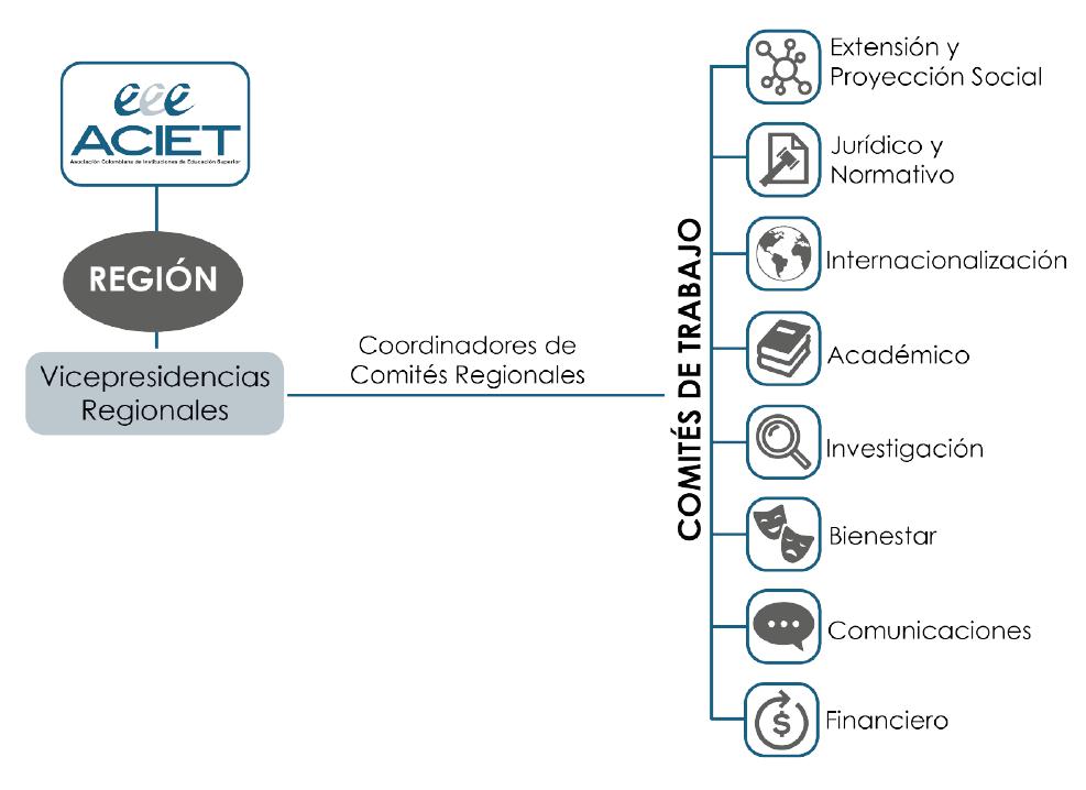 Son grupos conformados por los directivos de las diferentes áreas de trabajo de las instituciones de educación afiliadas, con el fin de atender a las necesidades regionales y nacionales para el fortalecimiento de la Educación Superior, participación e integración de las instituciones y el posicionamiento de ACIET.